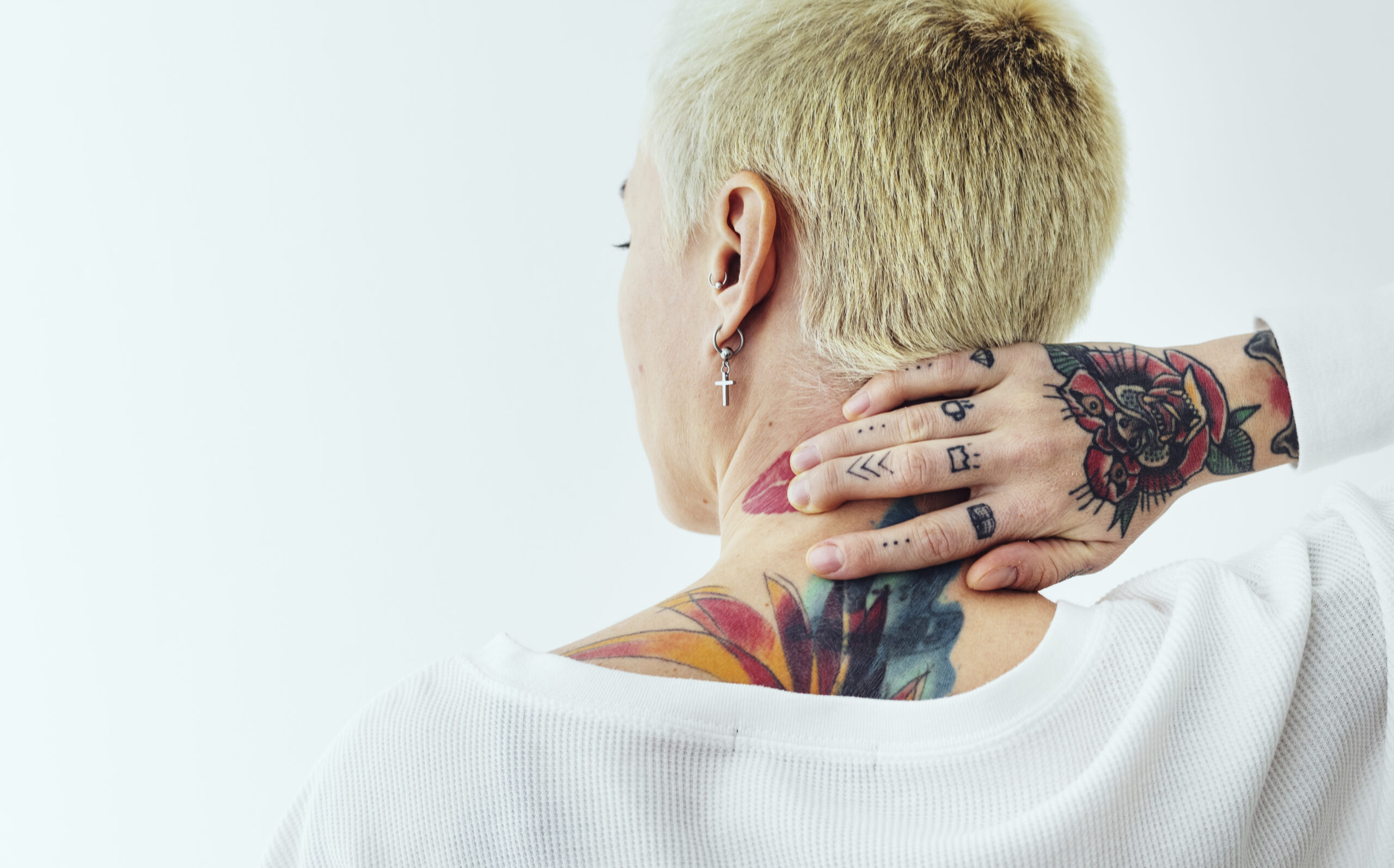 Tattooed woman touching her neck