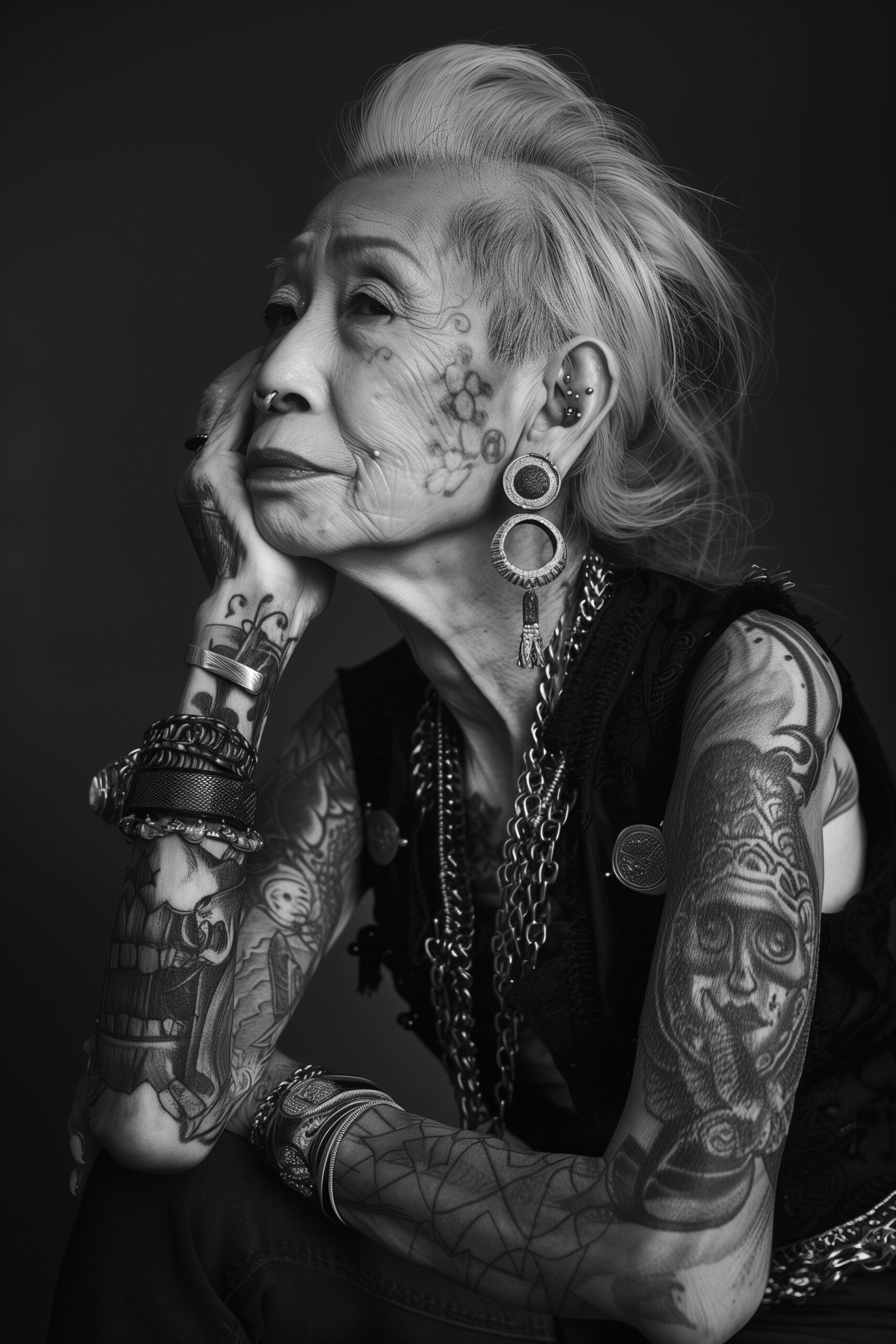 an old asian punk woman full of tattoo, full body black and white photoshoot, punk aesthetic, rebel, 4K –ar 2:3 –v 6 Job ID: 9f9160ea-c9f9-4606-b5cb-e61122d5df3b